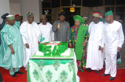 L-R; Former Vice President Namadi Sambo, Former Head of Interim Government Chief Ernest Shonekan, Former Head of State General Yakubu Gowon, Ex-President Goodluck Jonathan, Patience Goodluck Jonathan, Ex-Senate President David Mark and Ex-Deputy Speaker House Representatives Emeka Ihadioha jointly cutting the 54th Independence Anniversary cake in 2014, during Presidential Change of Guards Parade at the Forecourt of the Presidential villa Abuja